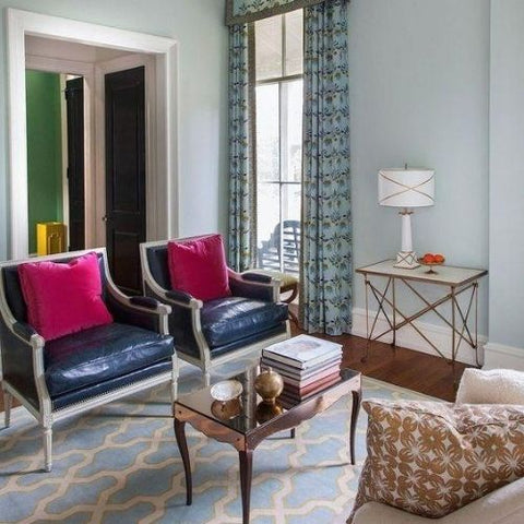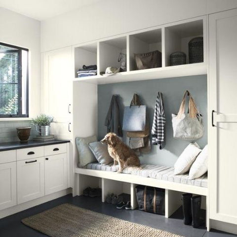 There is nothing like taking a bit of color inspiration from nature to create a seamless color flow from the interior of our homes to the outdoors. Breath of Fresh Air on the walls with Forrest Green on the doors in this entryway act as a color preview for the natural environment just beyond the front door.