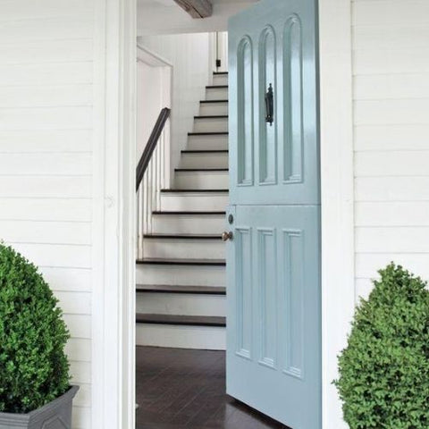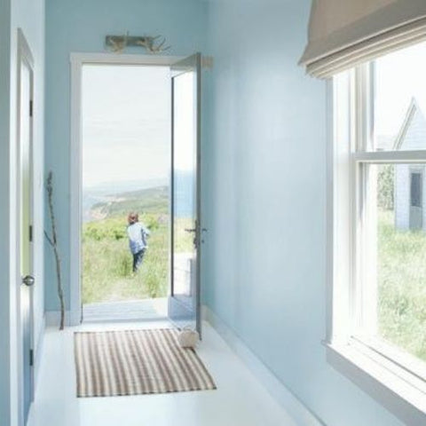Your front door can set the stage for the colors used throughout your home. Breath of Fresh Air 806 is a soothing blue that ushers in a calming palette. (EXTERIOR WALL & TRIM) Distant Gray 2124-70, Regal® Select Exterior MoorGard®, Low Lustre (DOOR) Breath of Fresh Air 806, Aura® Grand Entrance®, High Gloss
